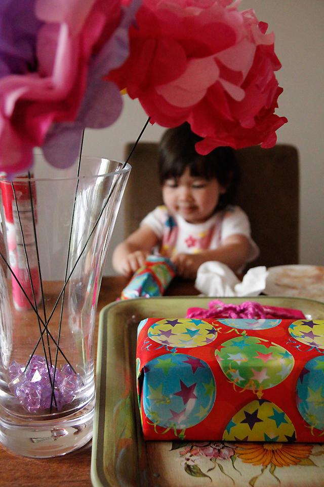 I used the tissue paper flowers I made and some of her presents on a tray to frame Zara. I even put the focus on the decorations. You’ll love to remember these little details.