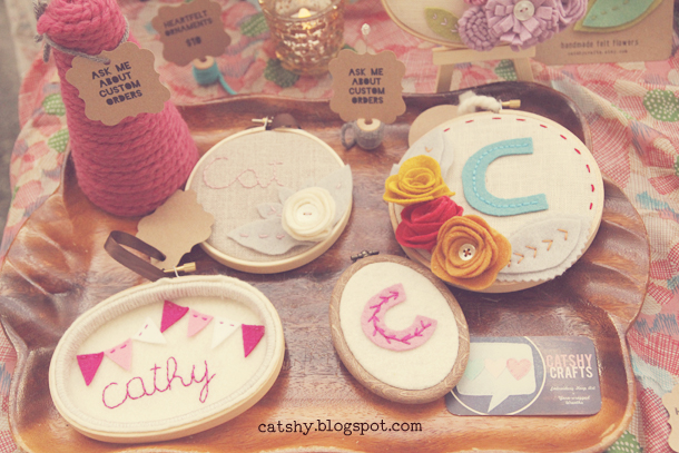 When I started the designing process, I knew that I wanted to keep my booth super simple. No elaborate set-ups. I wanted to keep it in line with the feel of Catshy Crafts: colorful, homespun, and crafty with a bit of vintage flair thrown in. Because I love thrifting and because I am on a budget (who isn’t?), I used many thrifted finds in my display along with items I bought or created myself.