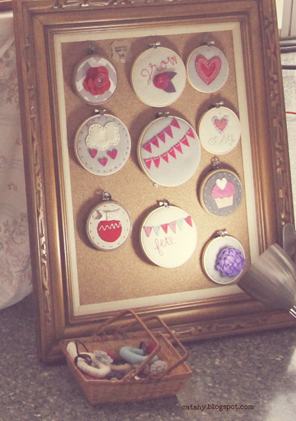 Leaning against the rack is a framed bulletin board that I DIY-ed from a garage sale picture frame (more details on this later in the post). Up front is a small wooden table for my business cards and a mailing list sign-up. Behind me, I took advantage of the curtained metal structure in front of the windows that the show organizers put up. I hung my Catshy Crafts sign (which I made from a quilting hoop and felt) and a felt bunting that I made for my art show a few years ago.