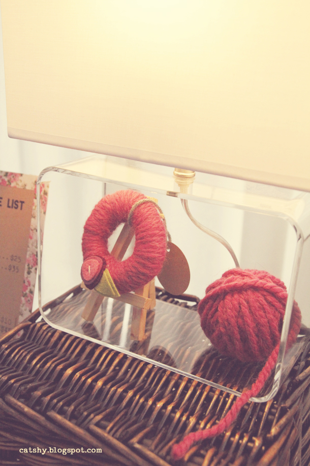 - I used small balls of yarn, kept together with a few decorative stickpins, as accents in my display. I tucked one in the lamp base, and placed some on the trays with my hoop art.