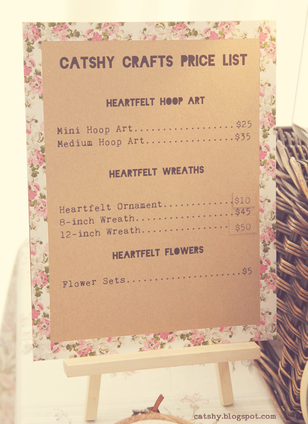 I am a paper lover. So any way I can throw in some paper-crafting, I’m all for it. Very similar to my product tags I make for all my handmade items, I used kraft paper, my favorite font, my printer and a paper punch to make several small signs, naming the item and the prices. I displayed these signs in a few different ways: