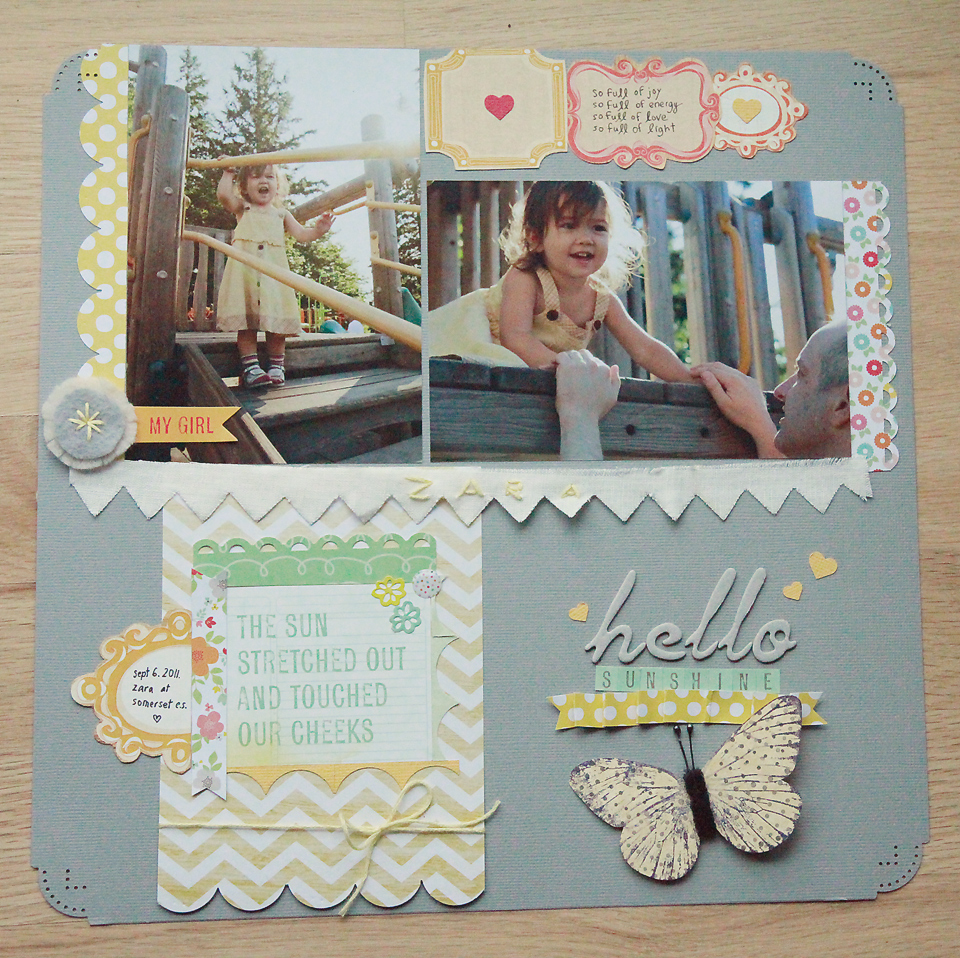 And I have a new layout to share. I made it using the February kit by Studio Calico, Daydream Believer. I was going for a yellow and grey palette with bits of red. I had a few Catshy touches: an embroidered felt flower circle (near “my girl” sticker) and some hand-embroidery with Zara’s name on the muslin banner.
