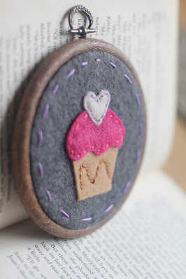 For the first three items, I departed from the blond wood embroidery hoop and used this faux bois (fake woodgrain) hoop. The hoop is rubbery so it slips over the felt. So there is no screw clasp to tighten. I like the richer look especially paired with the ruby red felt for the next two pieces.