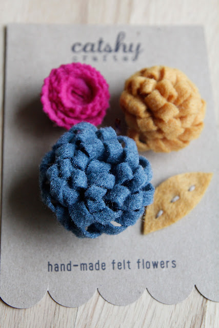 | My felt flowers come packaged on this kraft cardstock backing designed by me, tucked into a glassine envelope. |