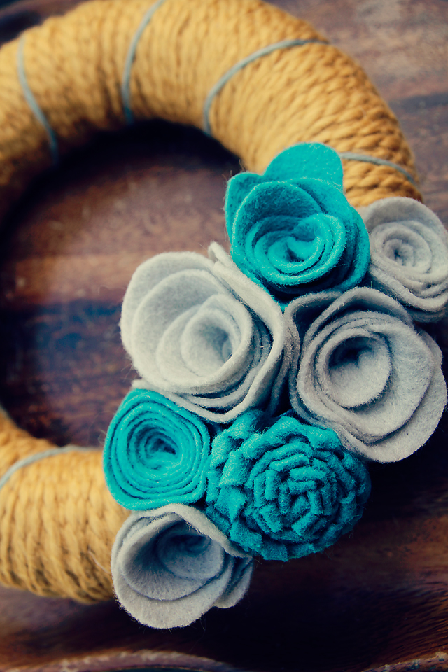 Here’s my latest wreath in the catshy shop: Mustard yellow yarn with accents of dusty teal yarn. Soft grey and bright teal handmade felt flowers (rolled rosettes and one tight loopy bud.) This one’s 8.5 inches in diameter. A bit smaller than your traditional wreath but it’s a great size to use indoors – on a bedroom door. In the kitchen. Or even as a centerpiece (with a few candles in the middle).