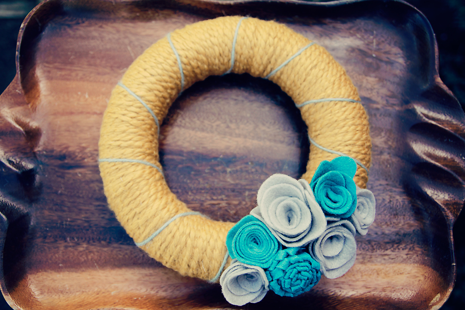 Here’s my latest wreath in the catshy shop: Mustard yellow yarn with accents of dusty teal yarn. Soft grey and bright teal handmade felt flowers (rolled rosettes and one tight loopy bud.) This one’s 8.5 inches in diameter. A bit smaller than your traditional wreath but it’s a great size to use indoors – on a bedroom door. In the kitchen. Or even as a centerpiece (with a few candles in the middle).