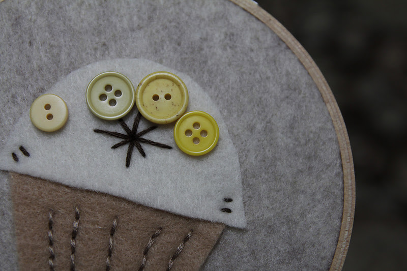 I was delighted to receive a convo (message on Etsy) from someone about doing a custom order. She liked two of the hoop art in my store: vanilla cream and pink scoop, but she wanted to customize them to fit the color scheme of her kitchen as well as her family’s favorite flavors. I loved the idea of creating two new pieces just for her. So once we decided on the colors of felt, buttons and embroidery thread, I went to work.